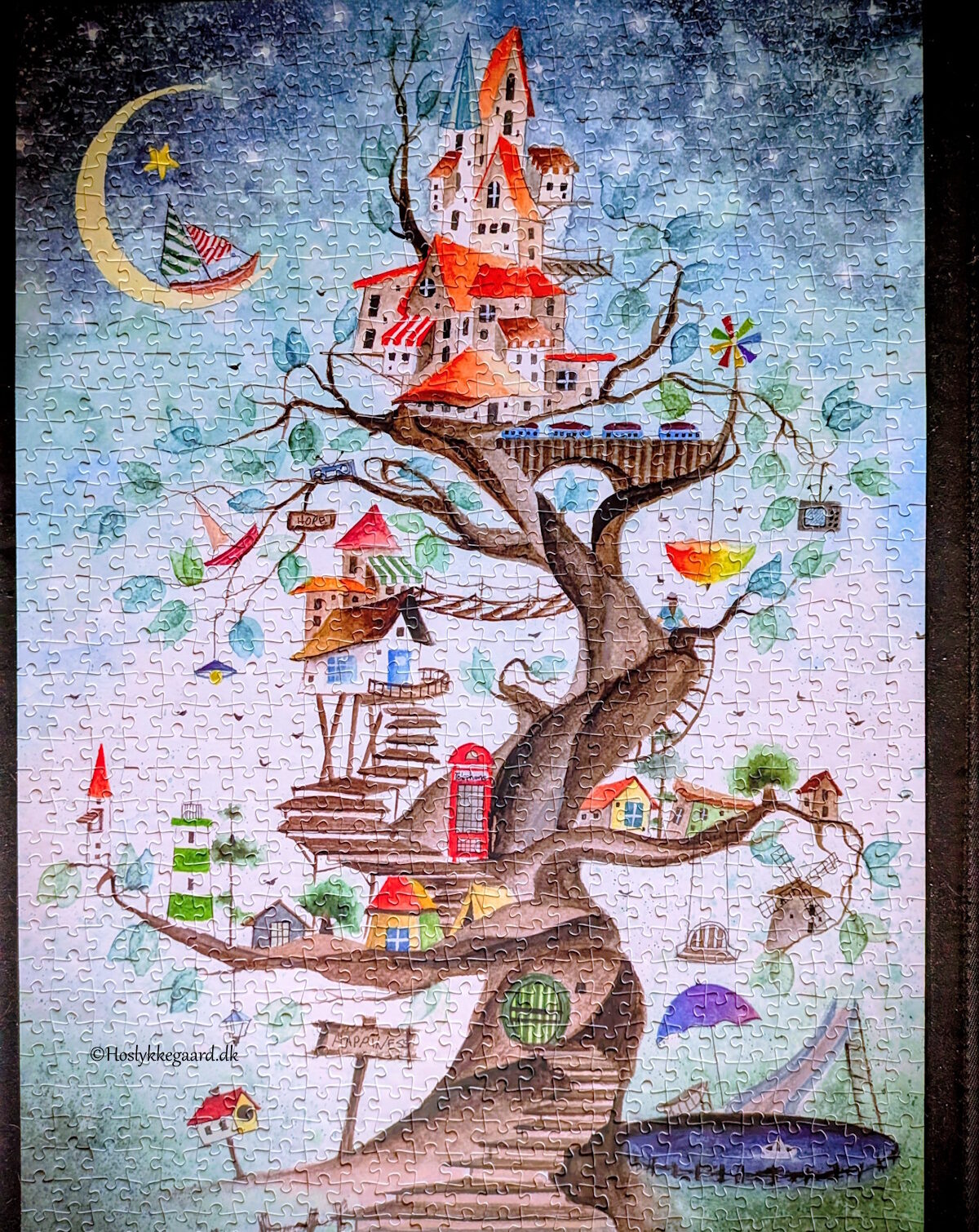 This puzzle was hard. I never thought I would complete it and I have quite a bit of puzzle experience by now. It took me 9 days – but I have to say in my defense that I didn’t work on it all 9 days – there was a break on one day when I didn’t touch it. I worked a total of 3-4 hours a day – so that’s 27-30 hours in total. The many similar colors were hard to see where they should be because the colors are repeated everywhere in the picture.